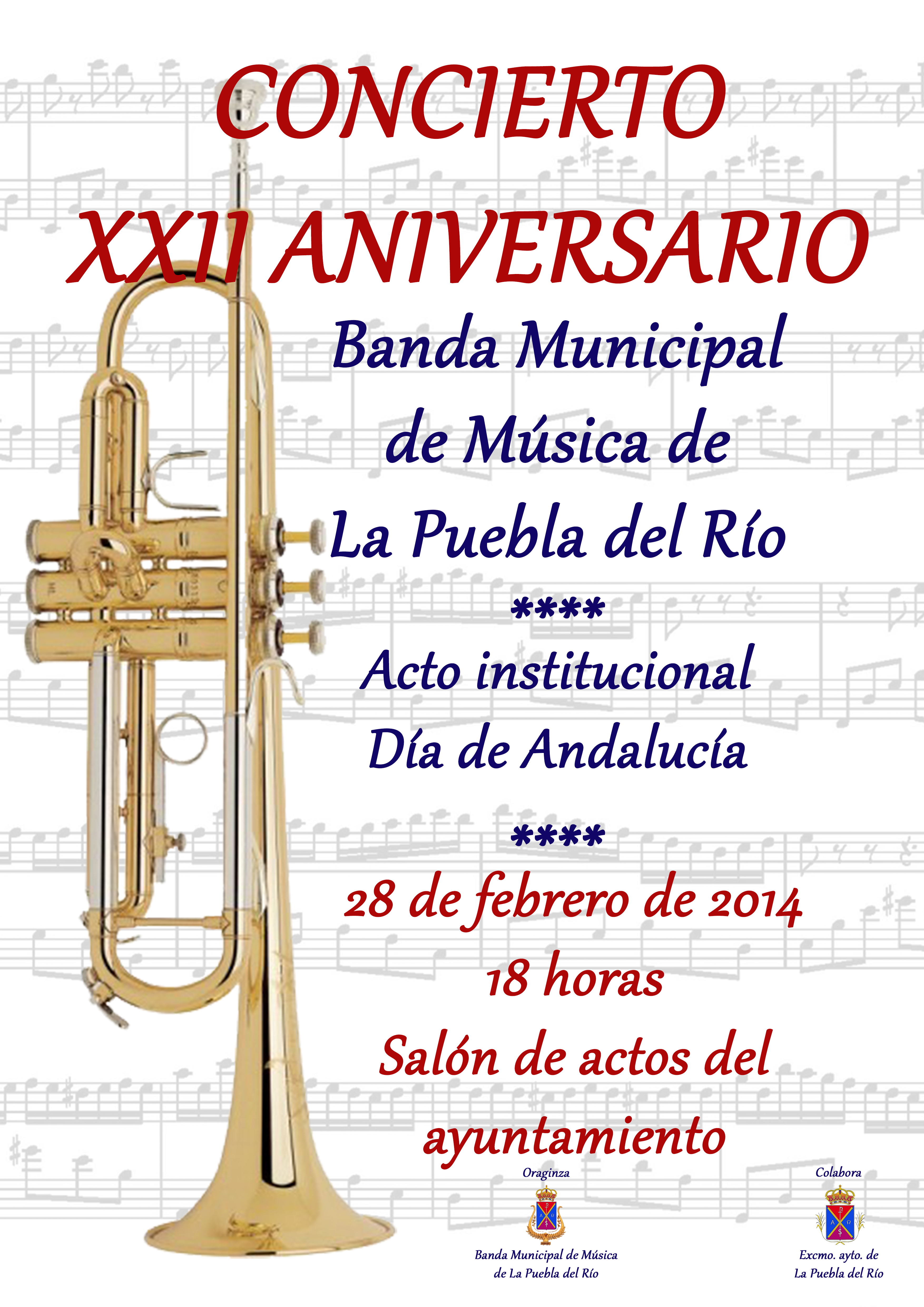 El próximo viernes 28 de febrero tendrá el lugar el tradicional concierto de aniversario y acto institucional por el día de Andalucía. Dicho concierto tendrá lugar en el salón de actos del ayuntamiento de La Puebla del Río a las 18 horas. En el intermedio actuará nuestra banda juvenil.